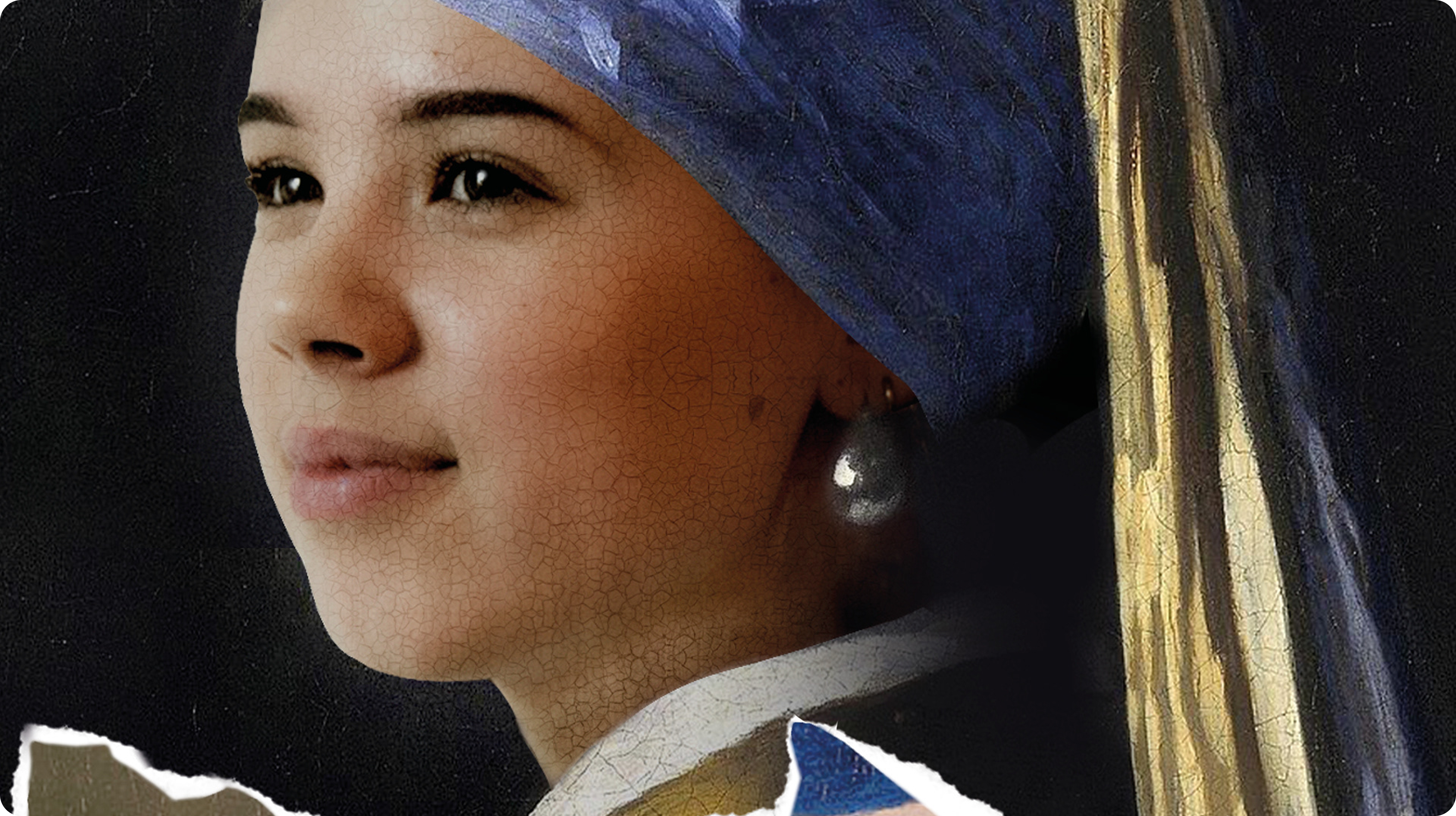 Om het schilderij wat meer eigen te maken heb ik een ander schilderij van Johannes Vermeer, ‘Het melkmeisje’, toegevoegd. Dit heb ik vormgegeven in een soort uitgescheurd stuk schilderij en doormiddel van InDesign over het andere schilderij gelegd.