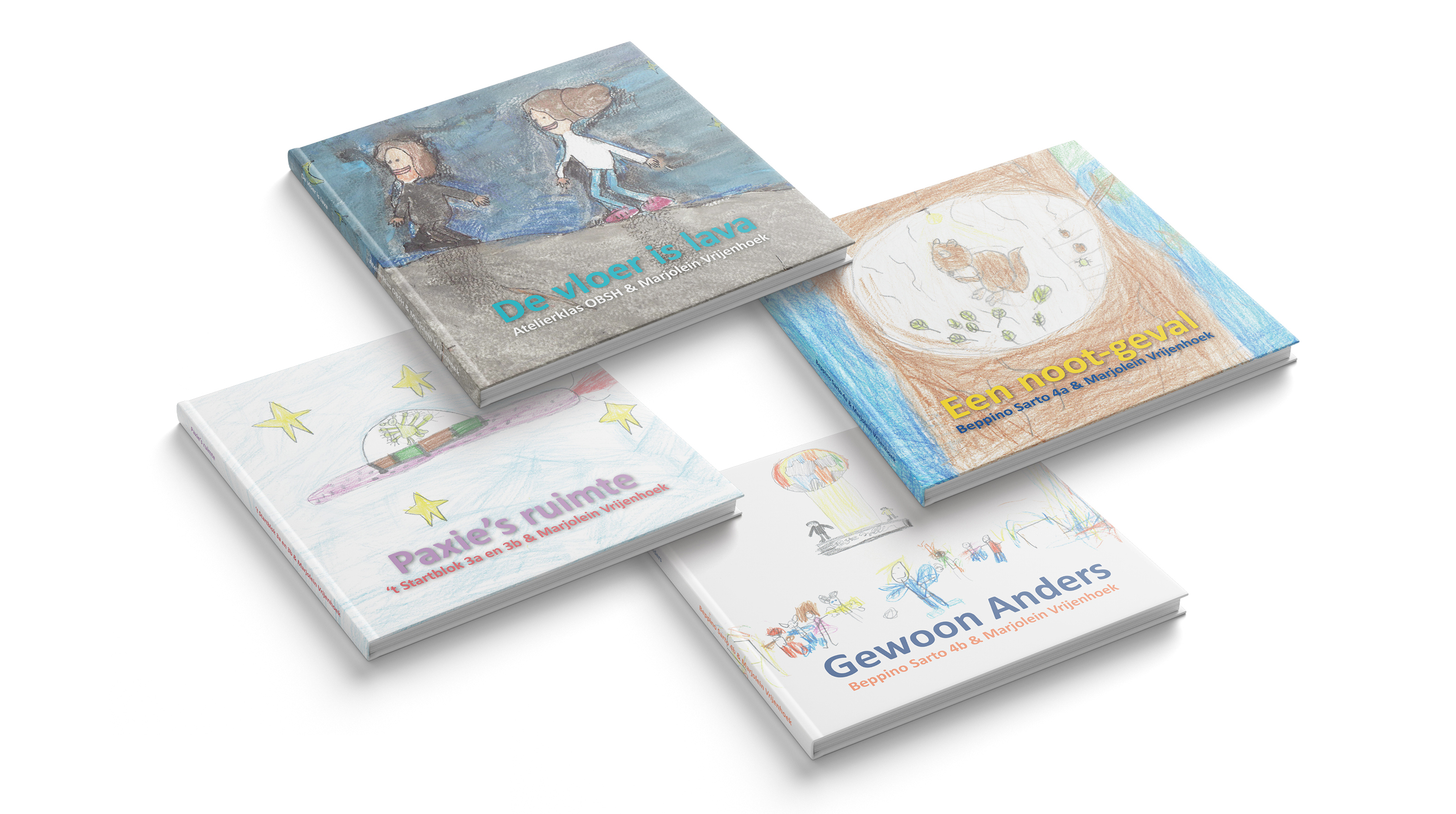 Marjolein Vrijenhoek, de schrijfster van deze boeken, heeft mij benaderd voor de vormgeving van haar boeken. Marjolein schrijft verhalen samen met een klas basisschoolkinderen. Zo stimuleert zij het leesgedrag van deze kinderen. Het proces begint met een brainstorm sessie samen met de kinderen. Daarna schrijft zij het verhaal en maken de kinderen de tekeningen voor in het boek. Later zal zij het boek voorlezen aan de klas en krijgt iedereen een eigen exemplaar.